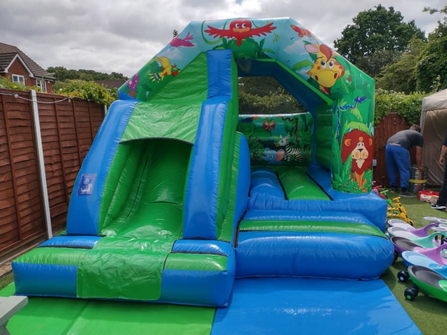Bring the fun and excitement of a jungle adventure to your next birthday party with our 15x12 Jungle themed bouncy castle with a slide! 🦁🌿