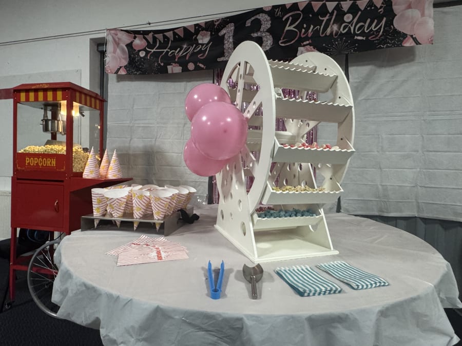 • 3ft Round Sweet Cart Ferris Wheel ๐ŸŽ : A stunning centrepiece that adds a touch of whimsy and delight to any room. This eye-catching Ferris wheel is filled with 14 different sweets, sure to satisfy every sweet tooth.